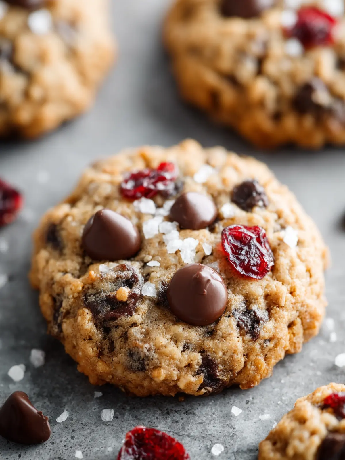 Delicious and chewy cookies loaded with oats, chocolate chips, and cranberries.