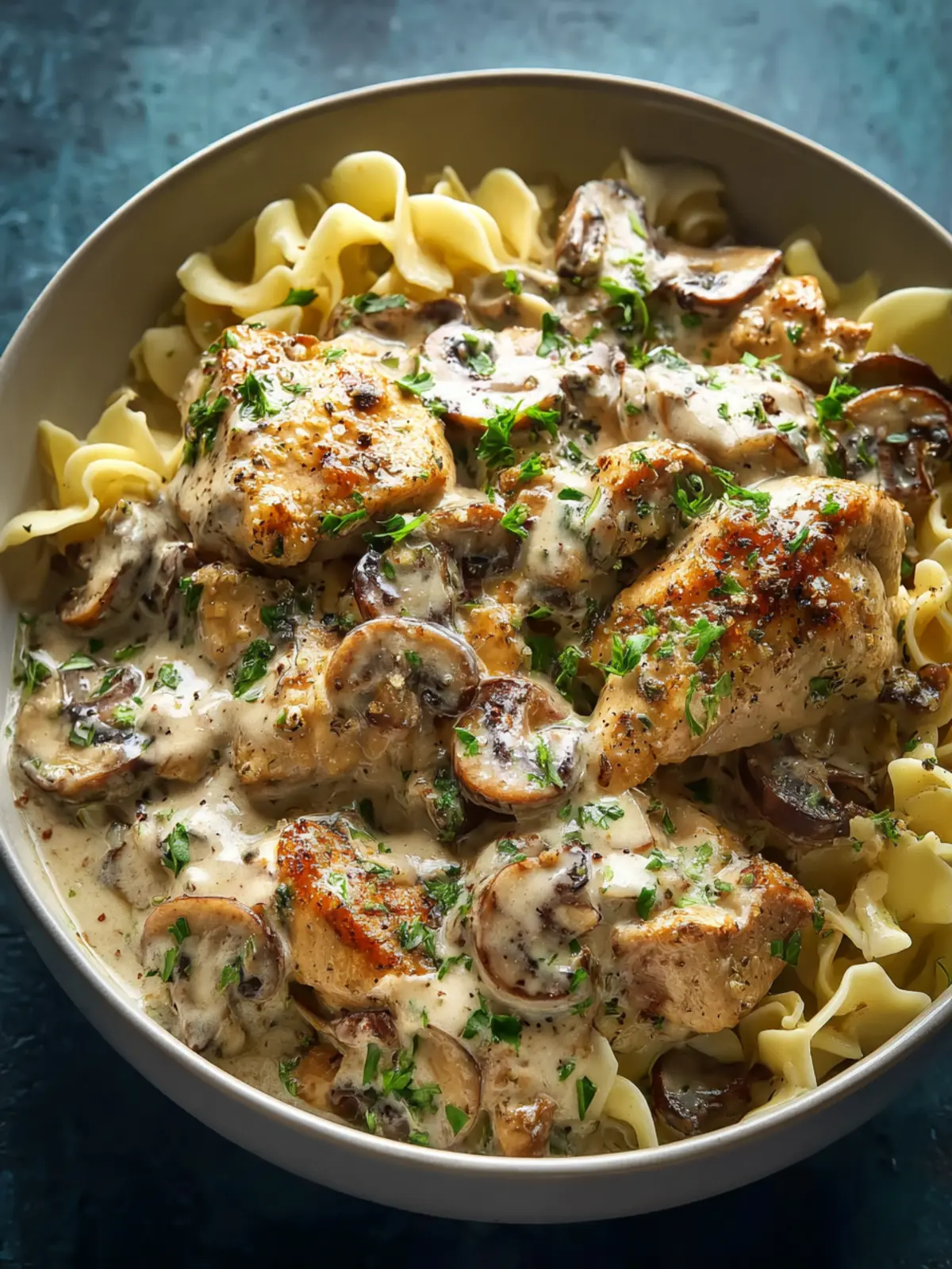 Serve your delicious rich chicken stroganoff over a bed of egg noodles or mashed potatoes. Garnishing with a sprinkle of fresh parsley not only adds color but also a hint of freshness.