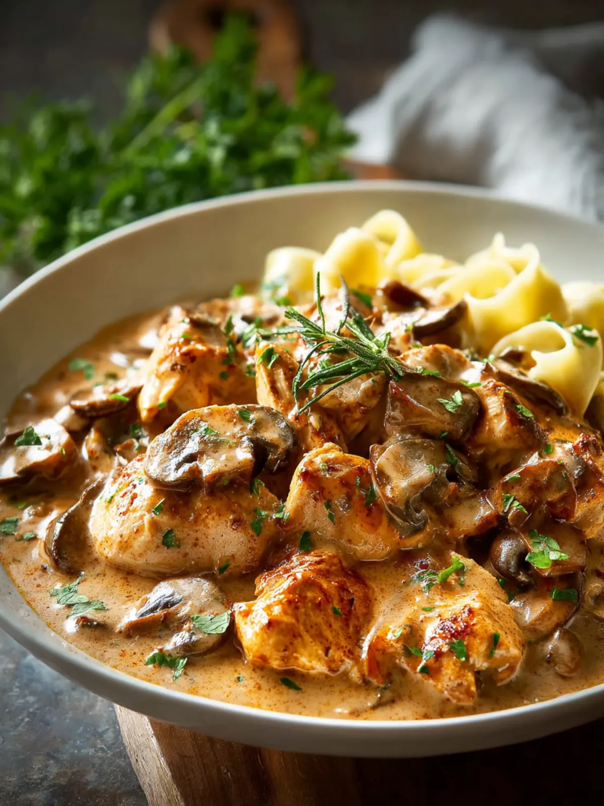 Seasoning: Salt, pepper, and fresh herbs like parsley or thyme are vital to harmonizing all the flavors in your delicious rich chicken stroganoff.
