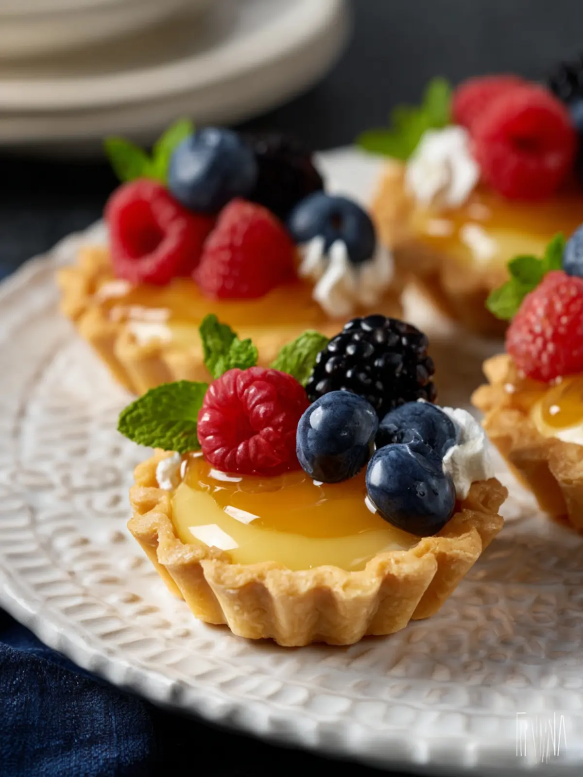 - Finally, adorn your tartlets with a sprig of fresh mint and a mix of blueberries and raspberries.