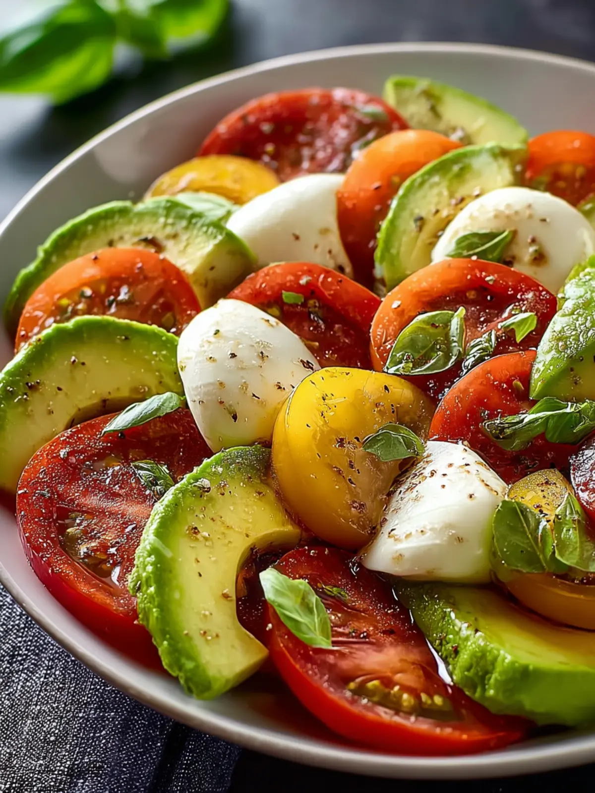 A refreshing salad made with ripe tomatoes, creamy mozzarella, and creamy avocado, drizzled with olive oil and balsamic vinegar.