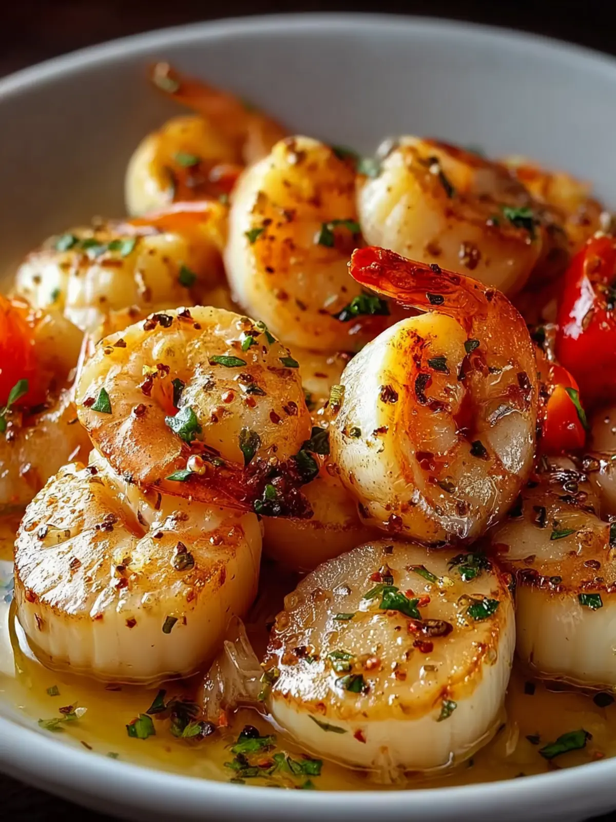 A delicious seafood dish featuring scallops and shrimp sautéed in garlic butter.